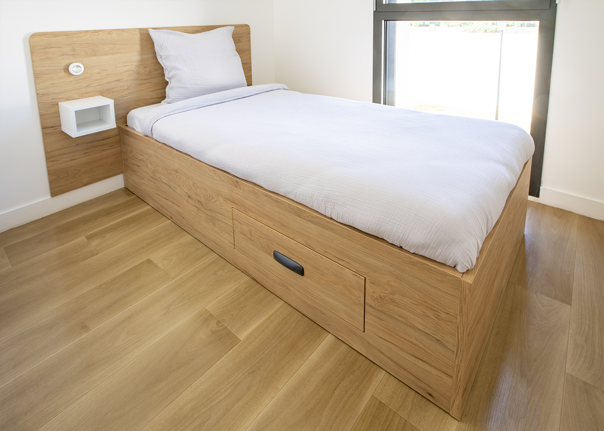 Les chambres ont été équipées avec la gamme Harby, reconnue pour sa robustesse et son design fonctionnel. Des adaptations spécifiques ont été développées pour ce projet, notamment des armoires à systèmes de clés multiples pour les chambres partagées, ainsi que des coffres intégrés aux lits, permettant de remplacer les chevets traditionnels et de libérer l’espace au sol. Ces aménagements favorisent à la fois la sécurité des jeunes et la facilité d’intervention du personnel.